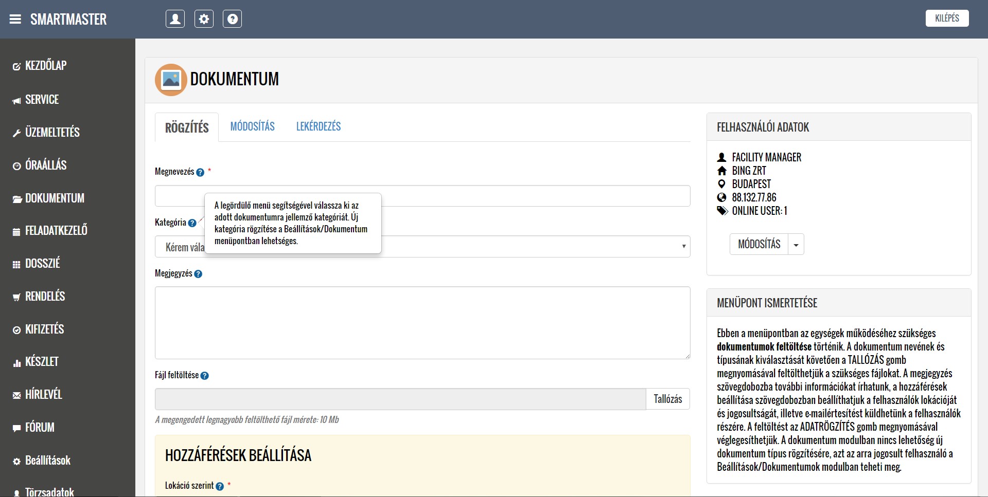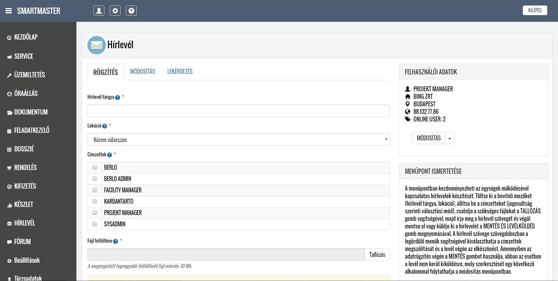 Beszélgessünk !A MINICAFM rendszer egy modulokból felépülő adatbázis alapú online épületüzemeltetési szoftver (facility management szoftver), mely alkalmas vagyonkezelők, épületüzemeltetők, pénzintézetek, önkormányzatok, kis és középvállalkozások elektronikus dokumentumkezelésére, ingatlanok üzemeltetésére, hibabejelentések kezelésére, belső kommunikációra (hírlevél és fórum), közüemi mérőórák fogyasztásainak rögzítésére, ismétlődő feladatok kezelésére, készletek nyilvántartására, rendelések lebonyolítására, projektkezelésre és a napi működéssel kapcsolatos egyedi nyilvántartások vezetésére. A rendszer fejlesztésénél elsődleges szempont volt az egyszerű kezelhetőség, felhasználóbarát felület, számítógépekre és okos telefonokra való optimalizálás, illetve a gyors és hatékony ügyintézési folyamatok alkalmazása. A különböző területek felelősei egyedileg beállíthatók a jogosultsági rendszer használatával (ügyintézők, karbantartók, középvezetők, facility managerek, felsővezetők és projekt managerek).