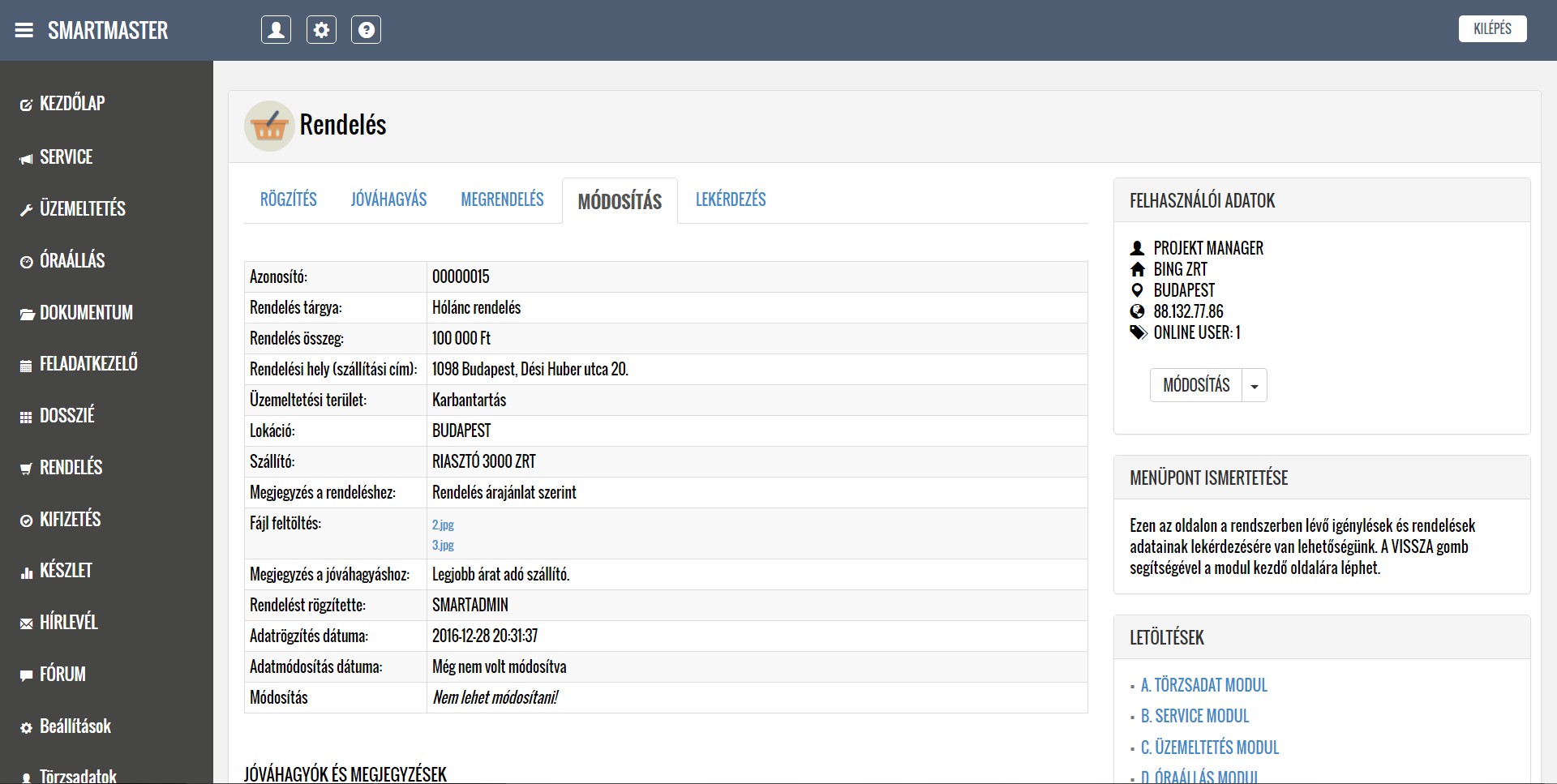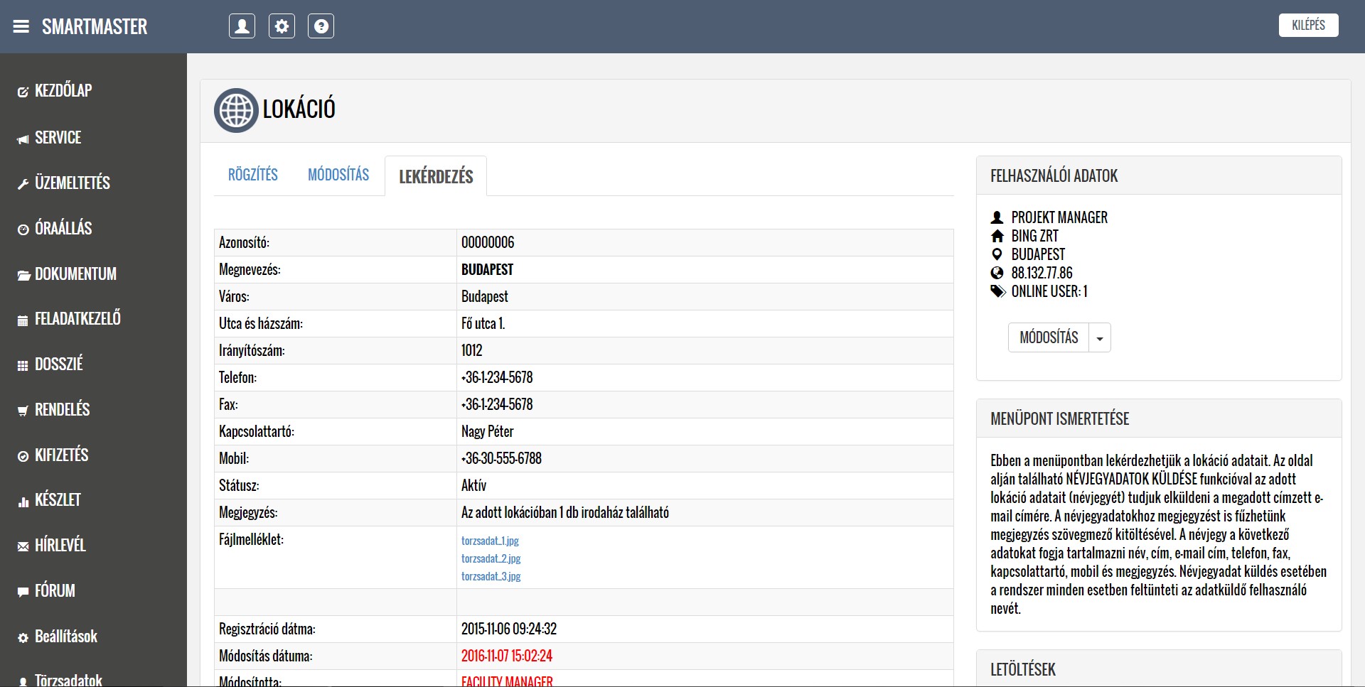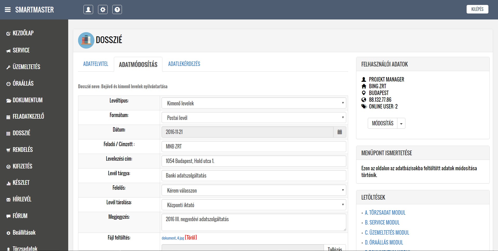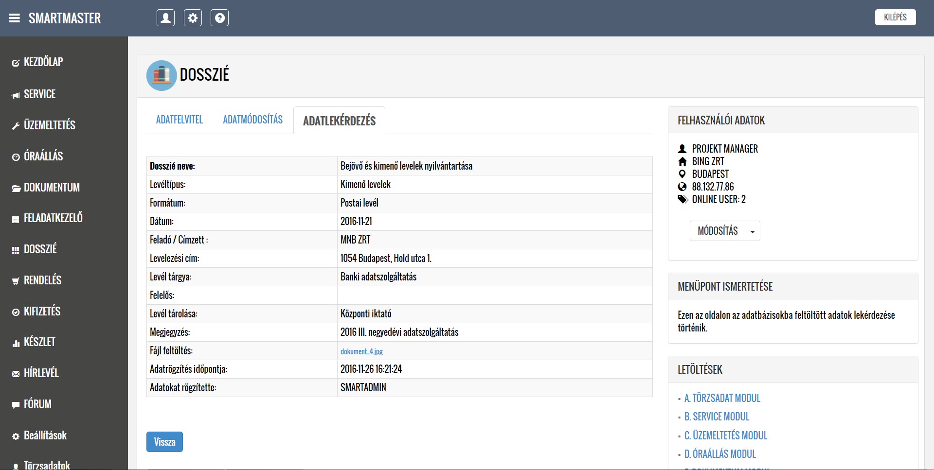 A lentiekben részletesen ismertetjük a modulok működését, a feltöltött képernyőképeken bemutatjuk a modulok menüpontjait, illetve letöltheti és elolvashatja a részletes felhasználói kézikönyveket. Köszönjük, hogy időt szakít az alkalmazásunk megismerésére, mely használata a jövőbeni munkáját nagymértékben megkönnyítheti. További kérdések esetén kollégáink szívesen állnak rendelkezésére a kapcsolati űrlap kitöltését, illetve közvetlen telefonos megkeresés esetén.