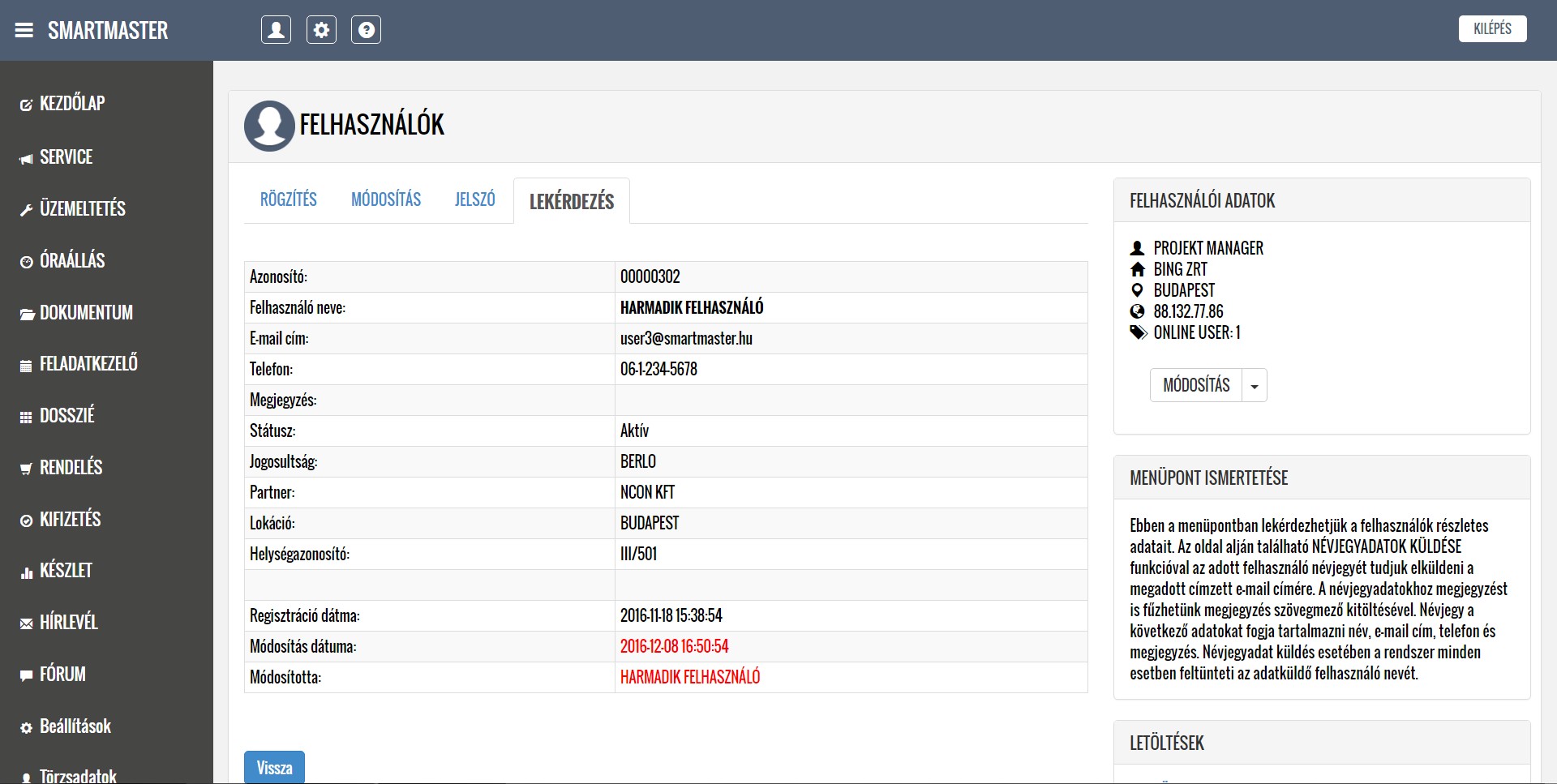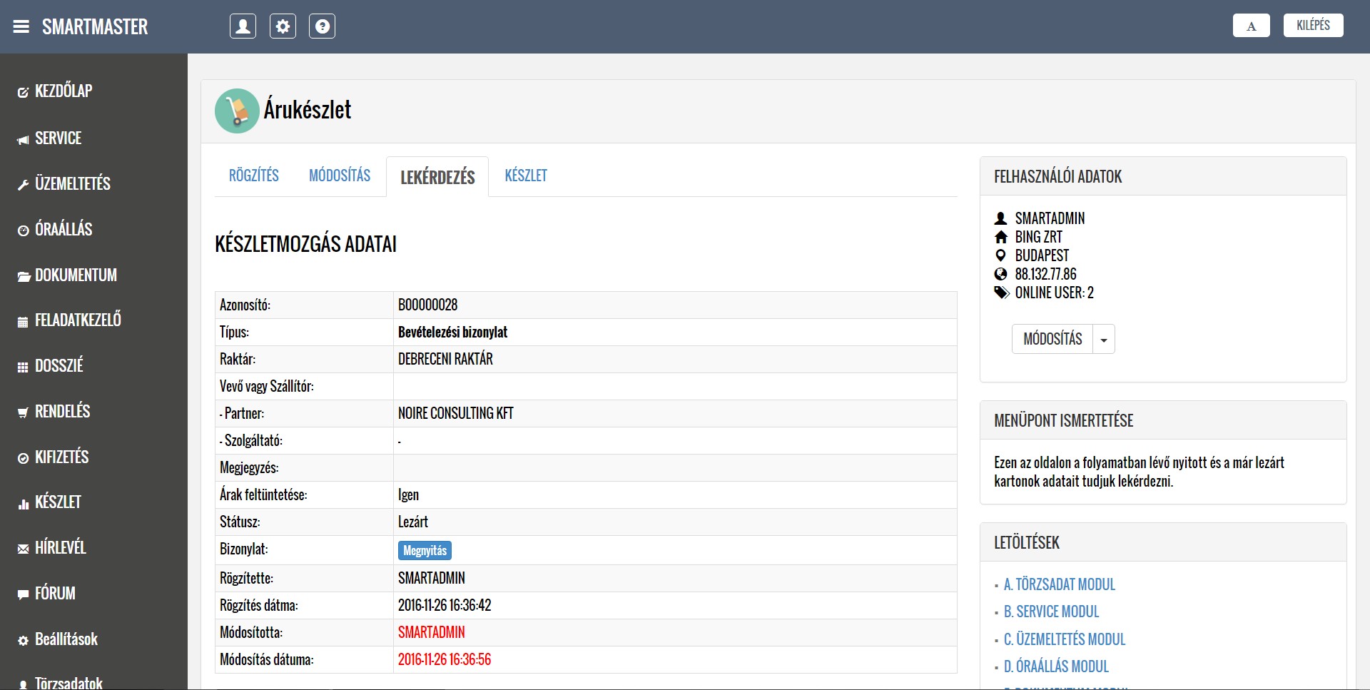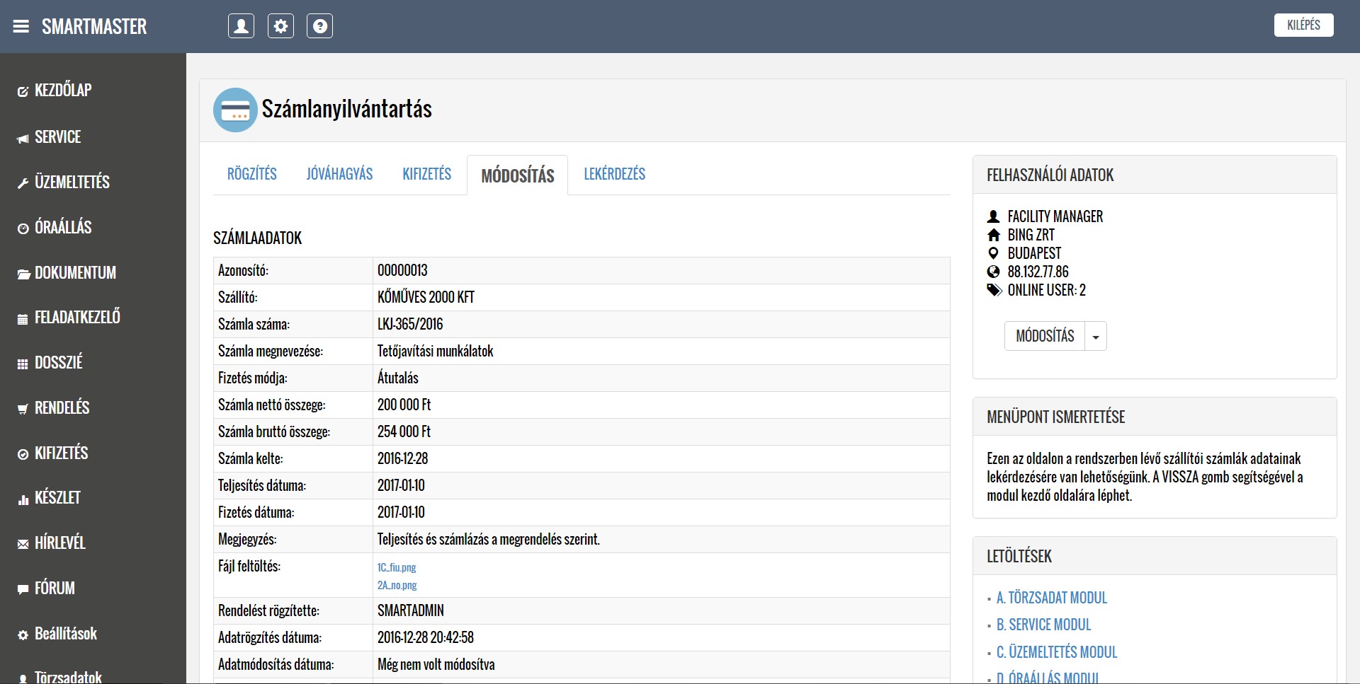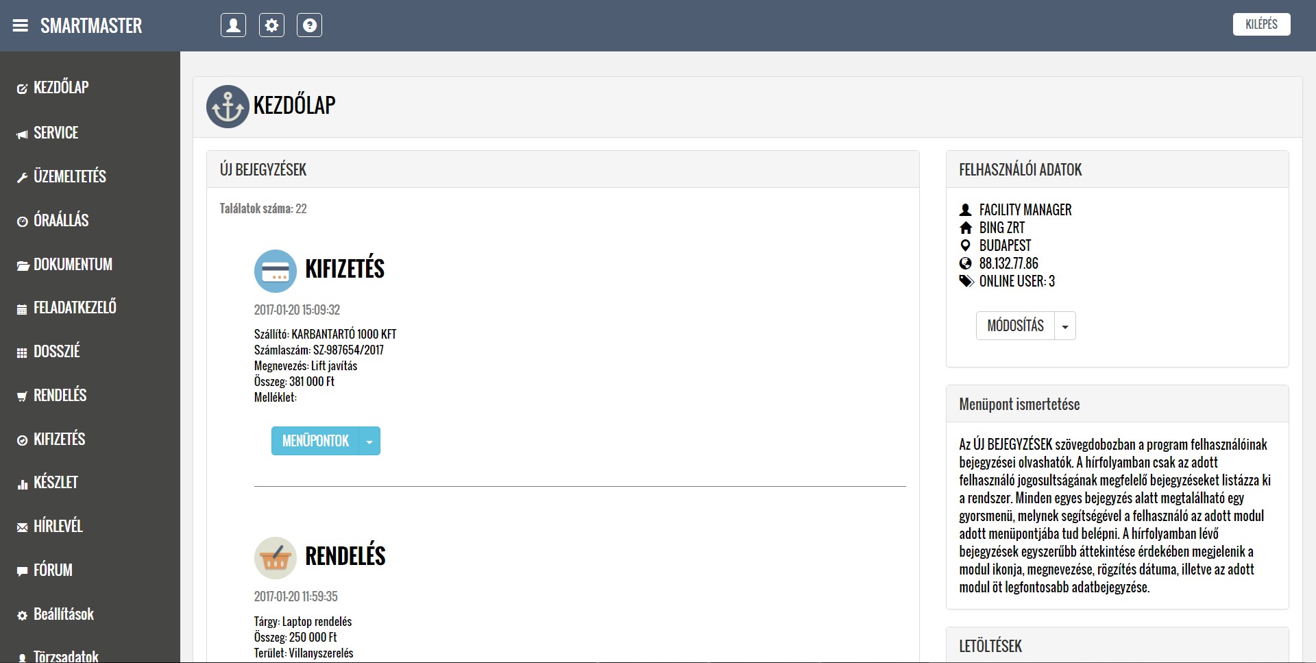 A lentiekben részletesen ismertetjük a modulok működését, a feltöltött képernyőképeken bemutatjuk a modulok menüpontjait, illetve letöltheti és elolvashatja a részletes felhasználói kézikönyveket. Köszönjük, hogy időt szakít az alkalmazásunk megismerésére, mely használata a jövőbeni munkáját nagymértékben megkönnyítheti. További kérdések esetén kollégáink szívesen állnak rendelkezésére a kapcsolati űrlap kitöltését, illetve közvetlen telefonos megkeresés esetén.