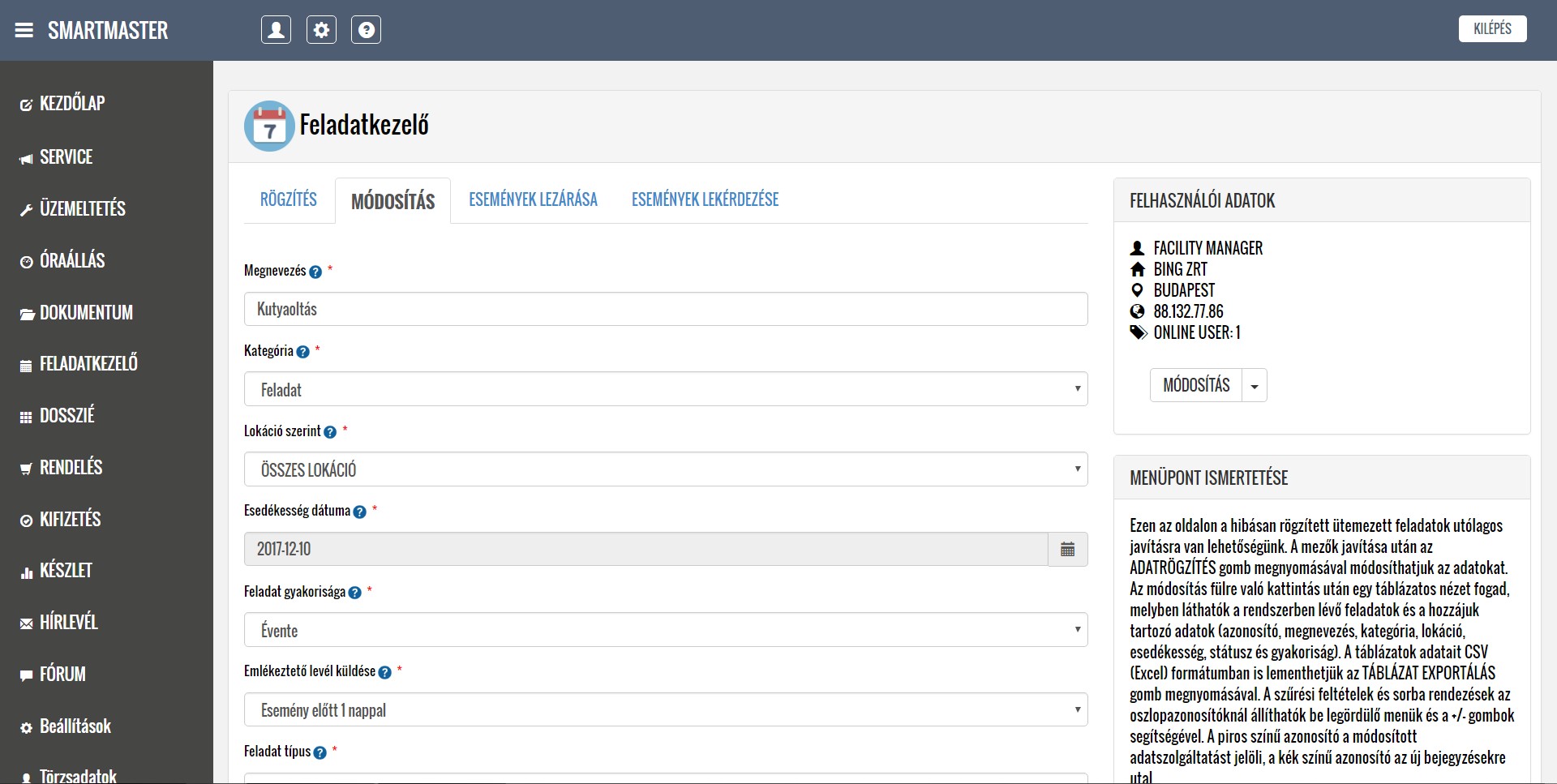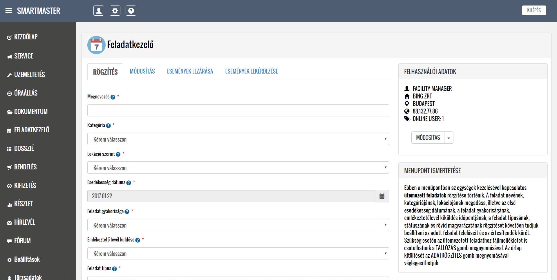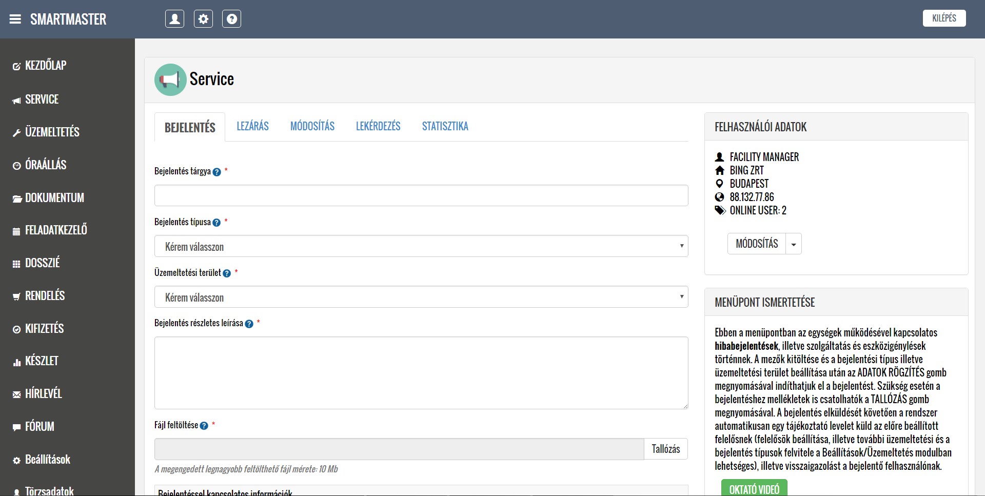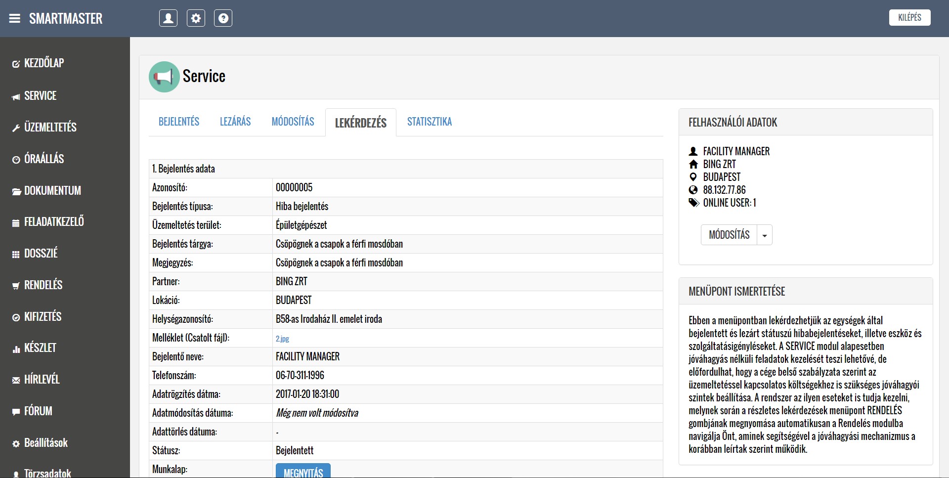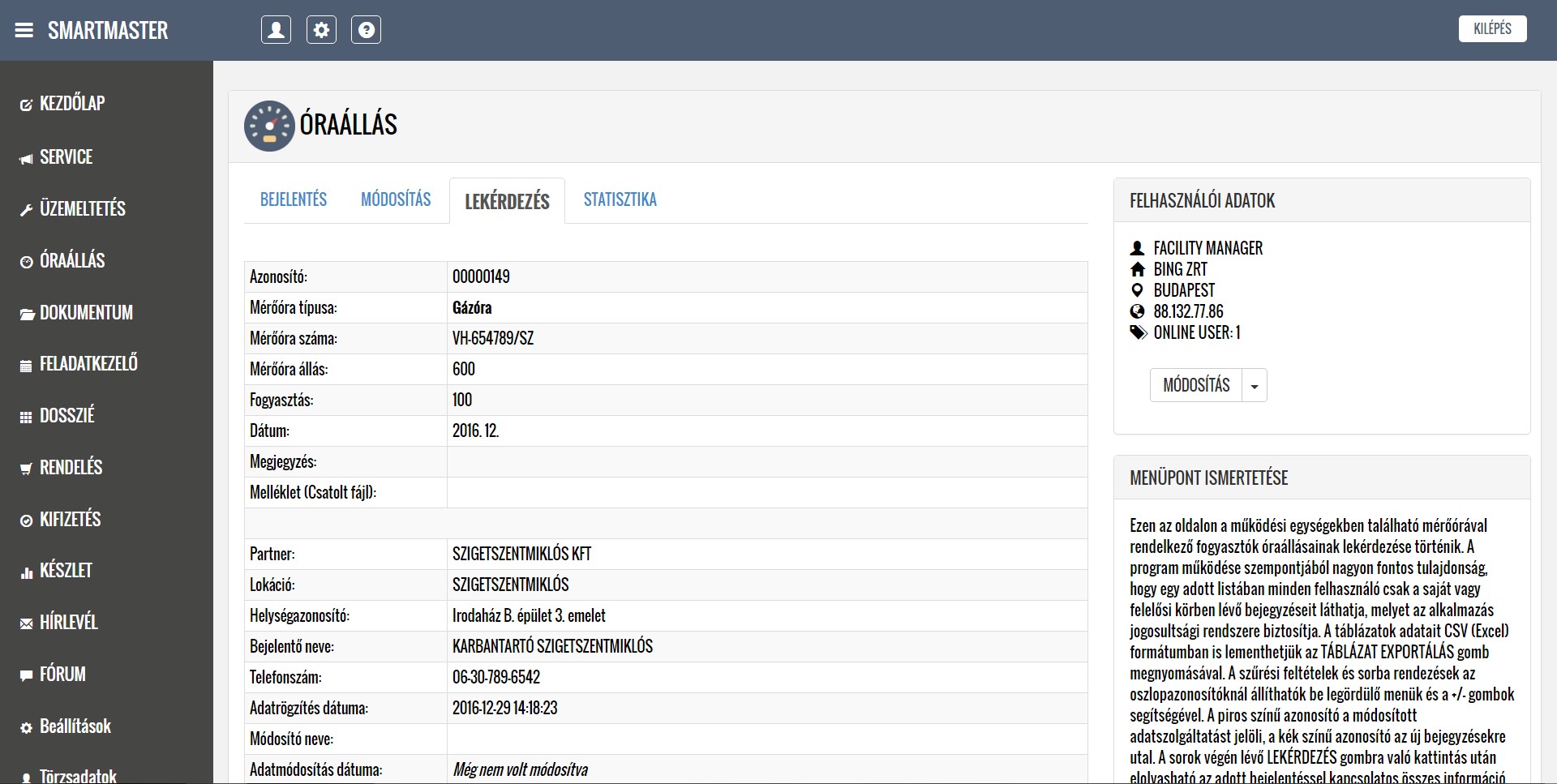 A rendszer segítségével kezelni tudják a lokációkból érkező hibabejelentéseket, ütemezik és dokumentálják a karbantartási feladatokat, illetve nyilván tartják a közüzemi mérőórák fogyasztásait
