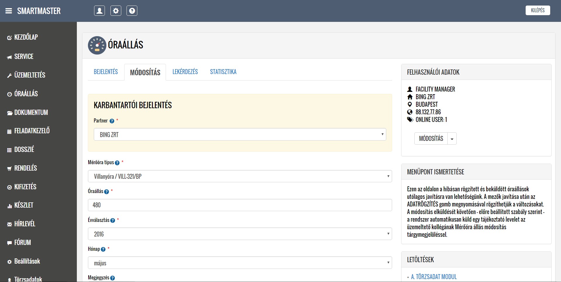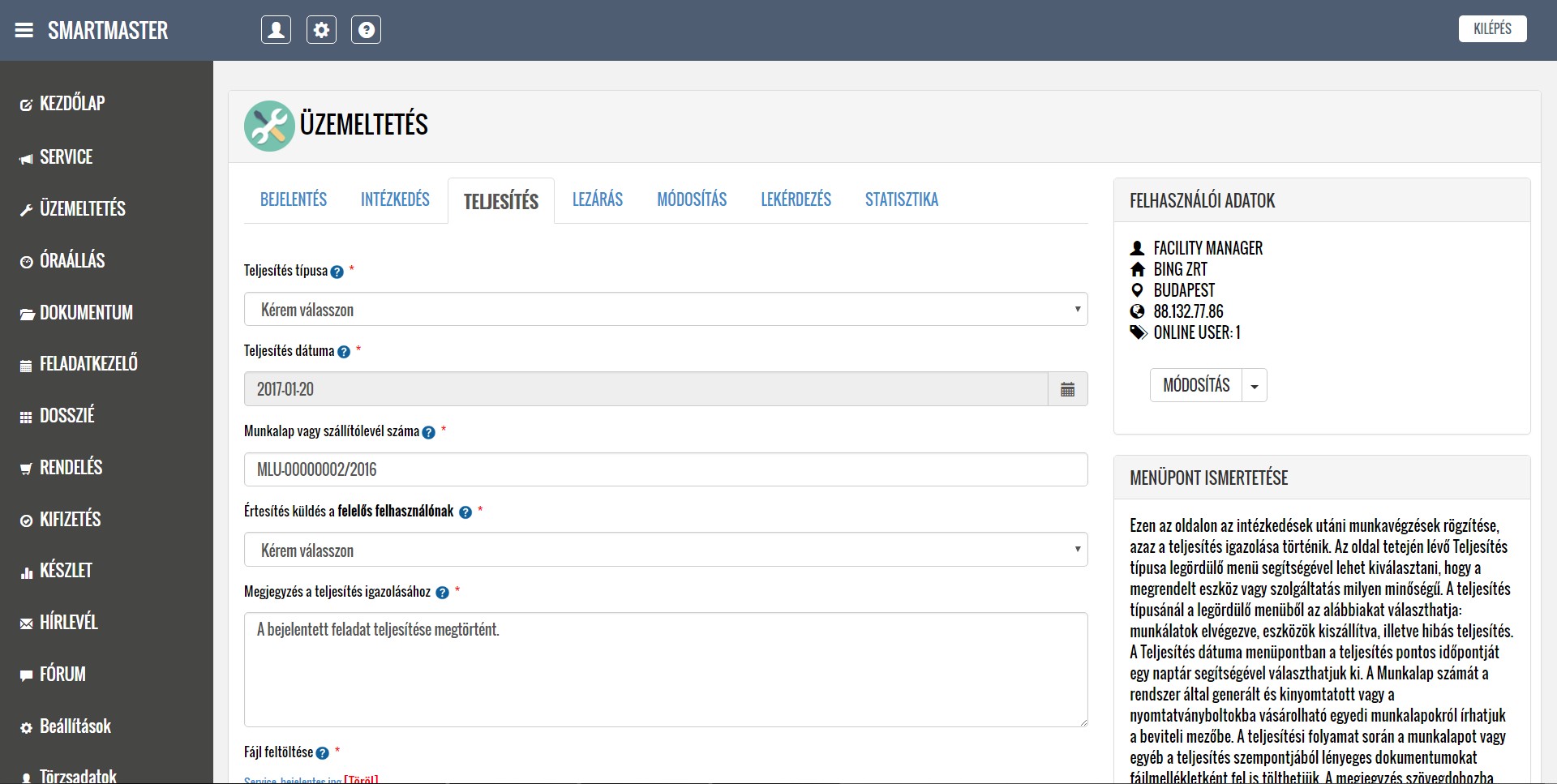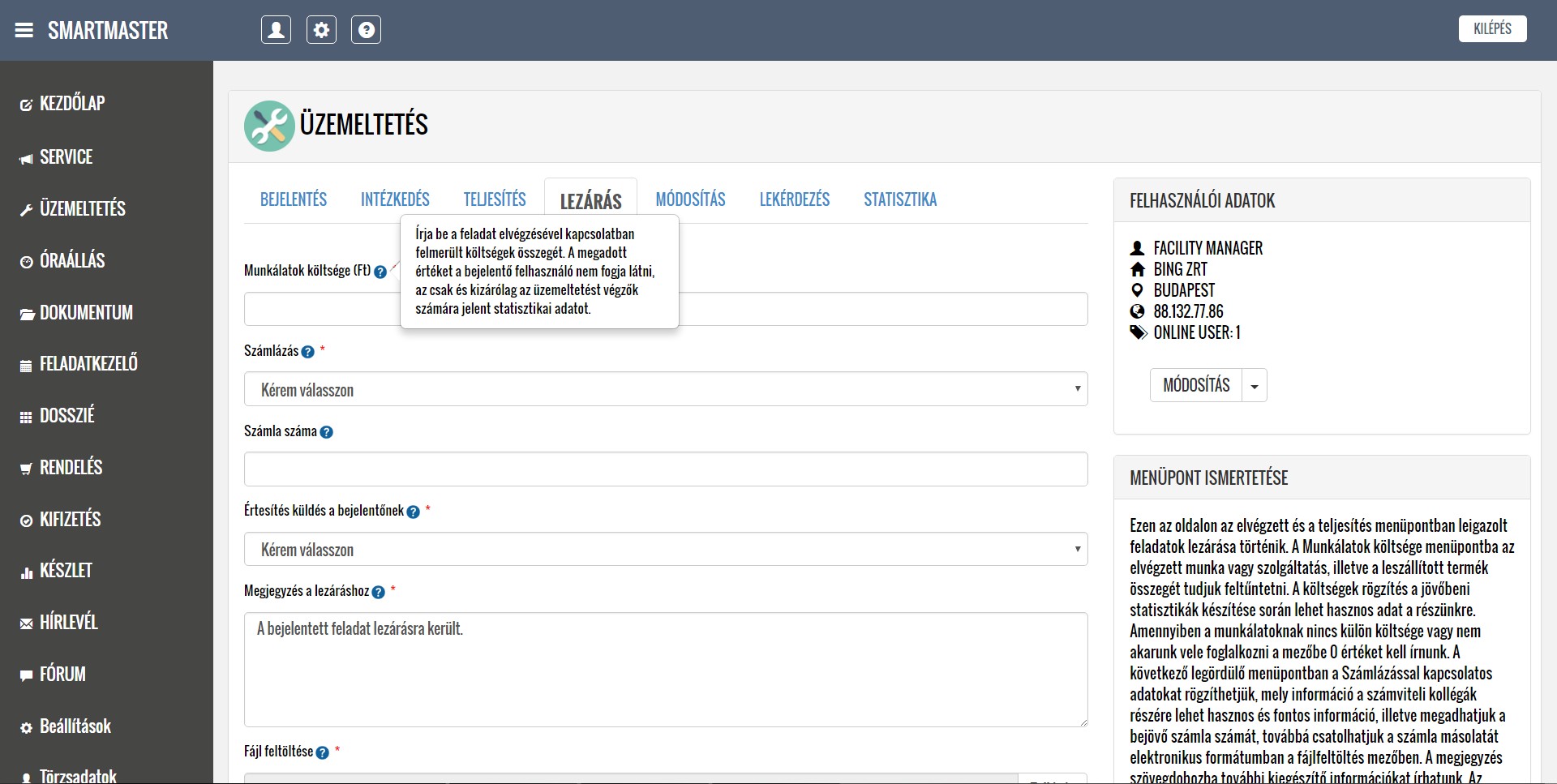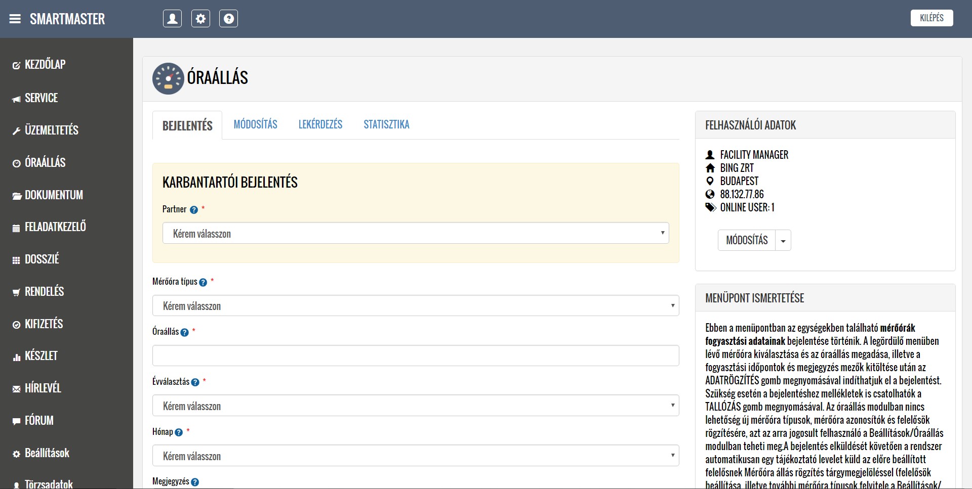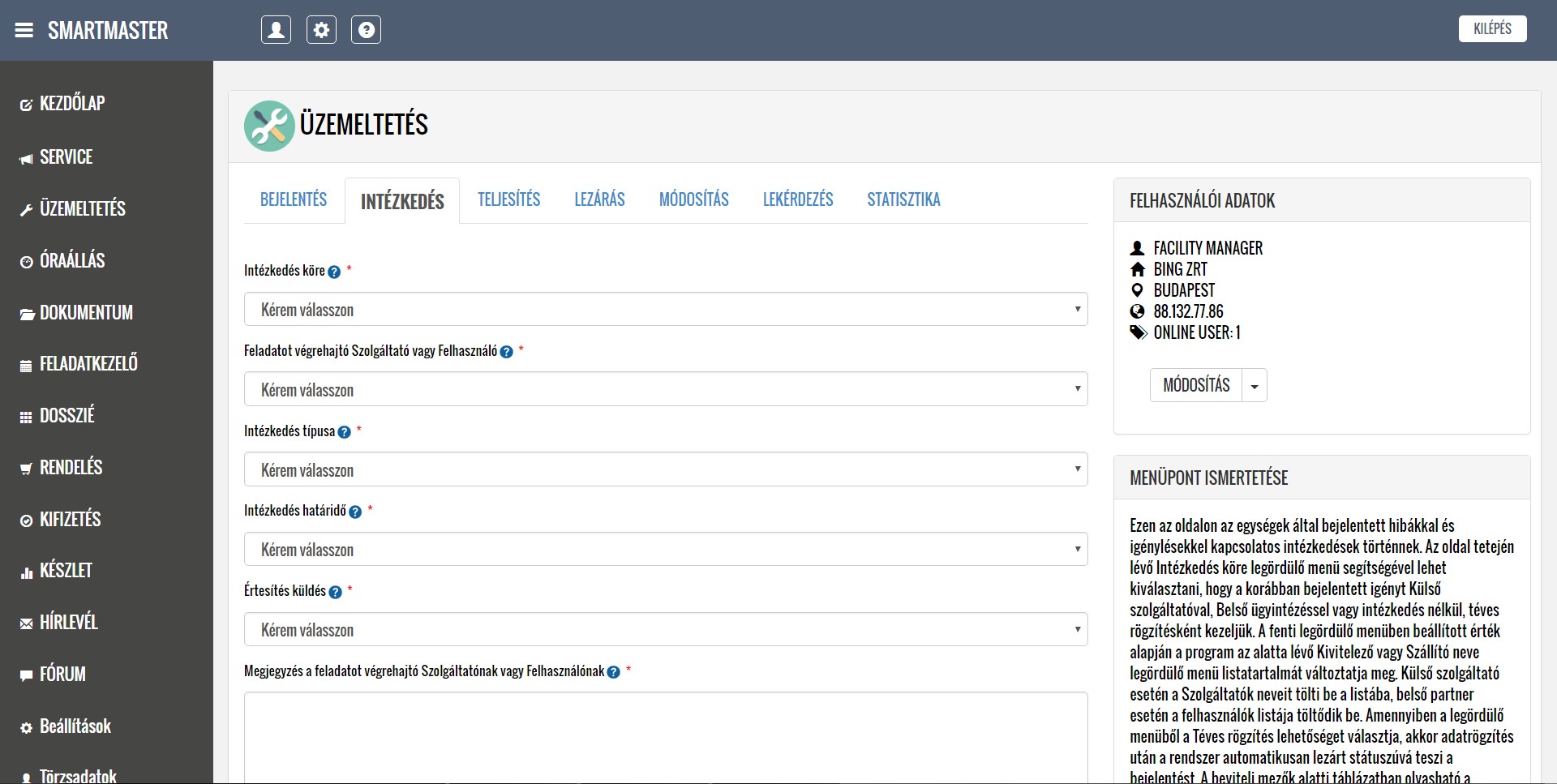 A rendszer segítségével kezelni tudják a lokációkból érkező hibabejelentéseket, ütemezik és dokumentálják a karbantartási feladatokat, illetve nyilván tartják a közüzemi mérőórák fogyasztásait