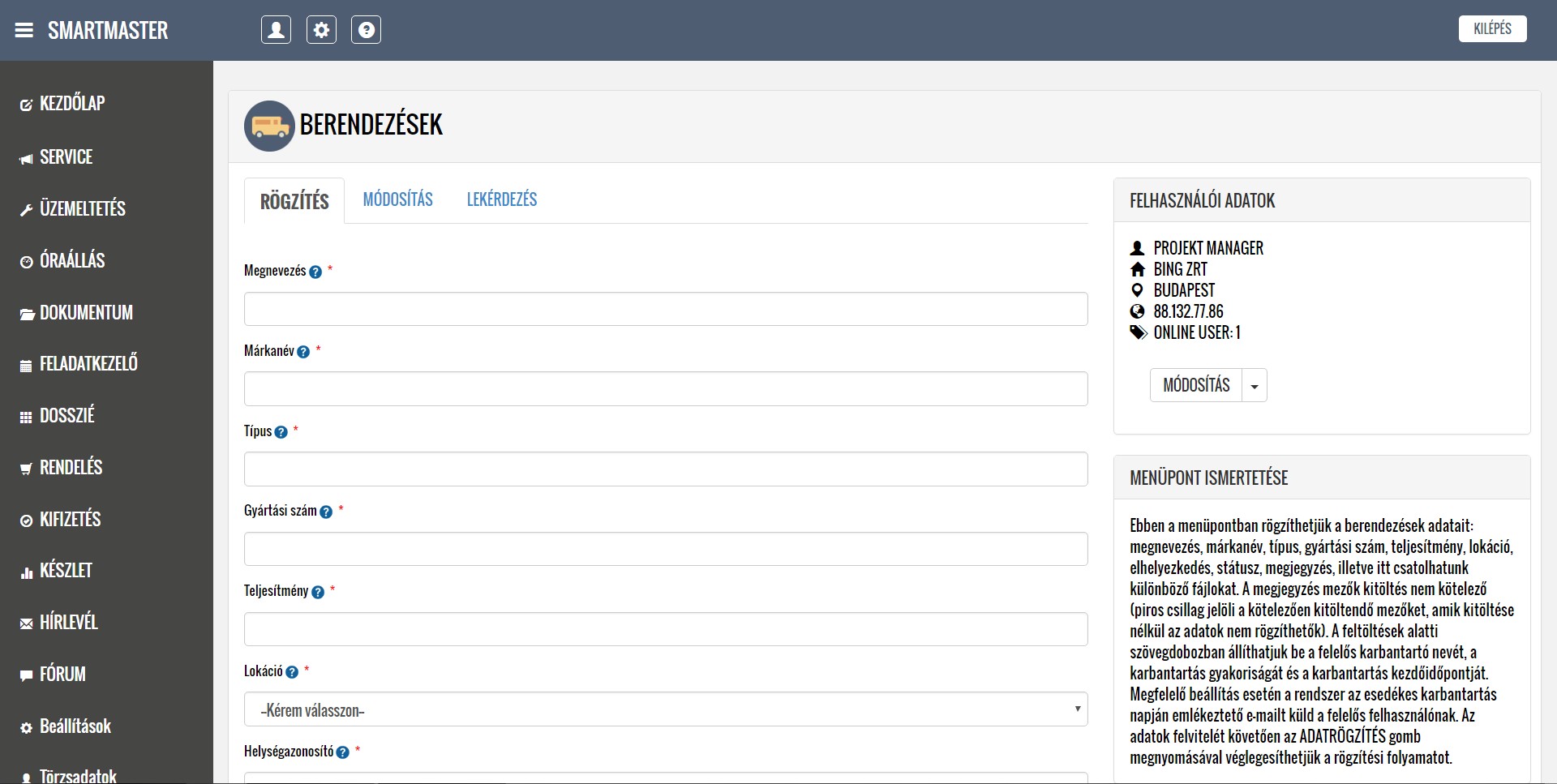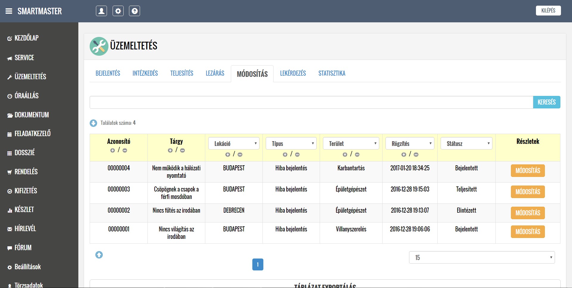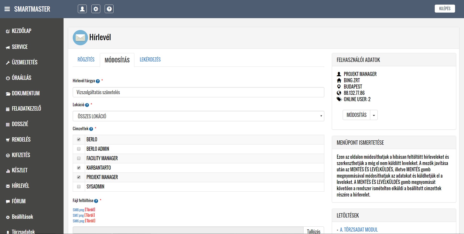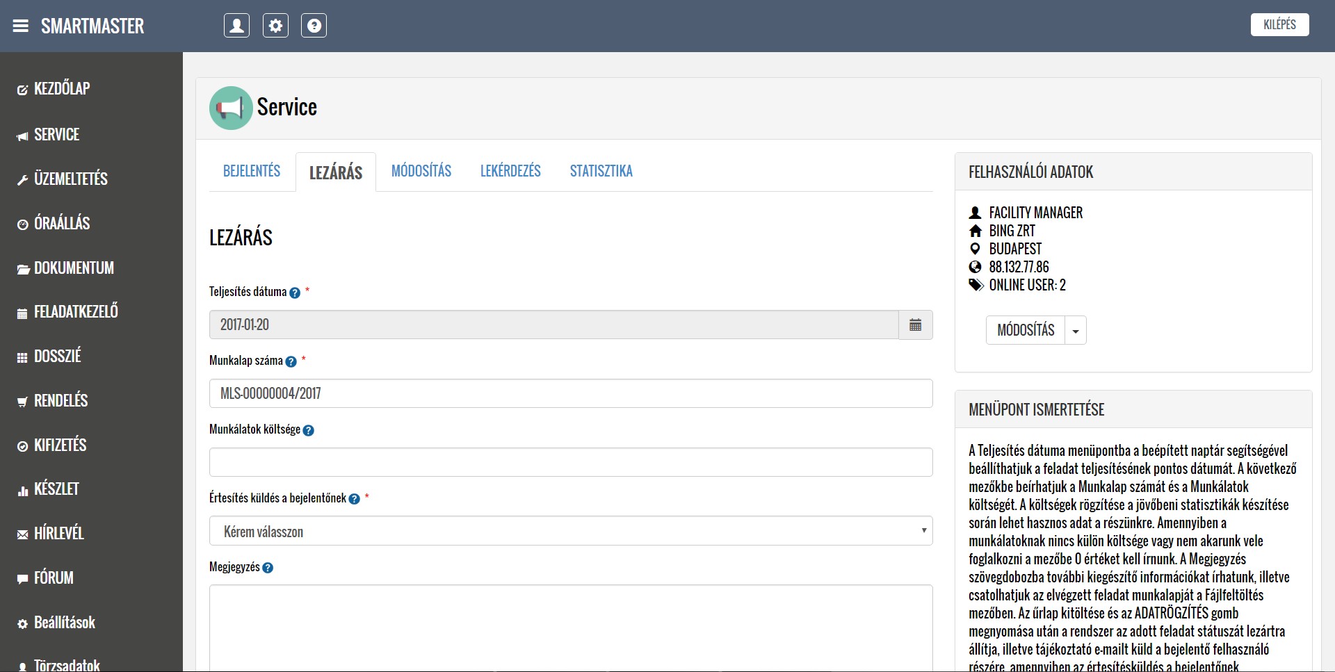 A rendszer segítségével kezelni tudják a lokációkból érkező hibabejelentéseket, ütemezik és dokumentálják a karbantartási feladatokat, illetve nyilván tartják a közüzemi mérőórák fogyasztásait