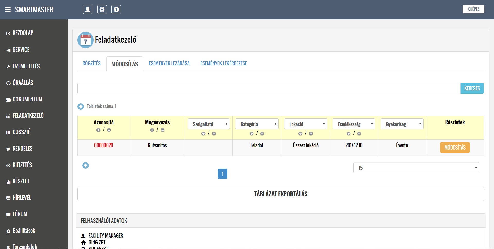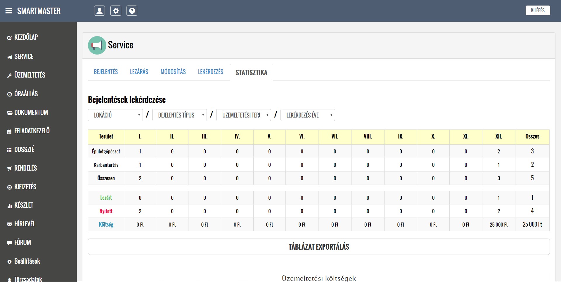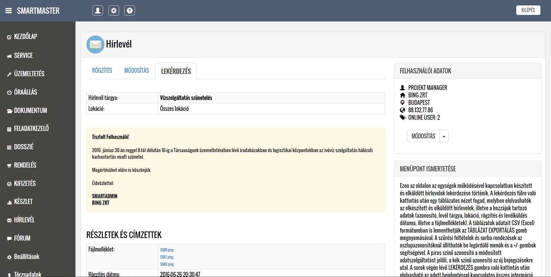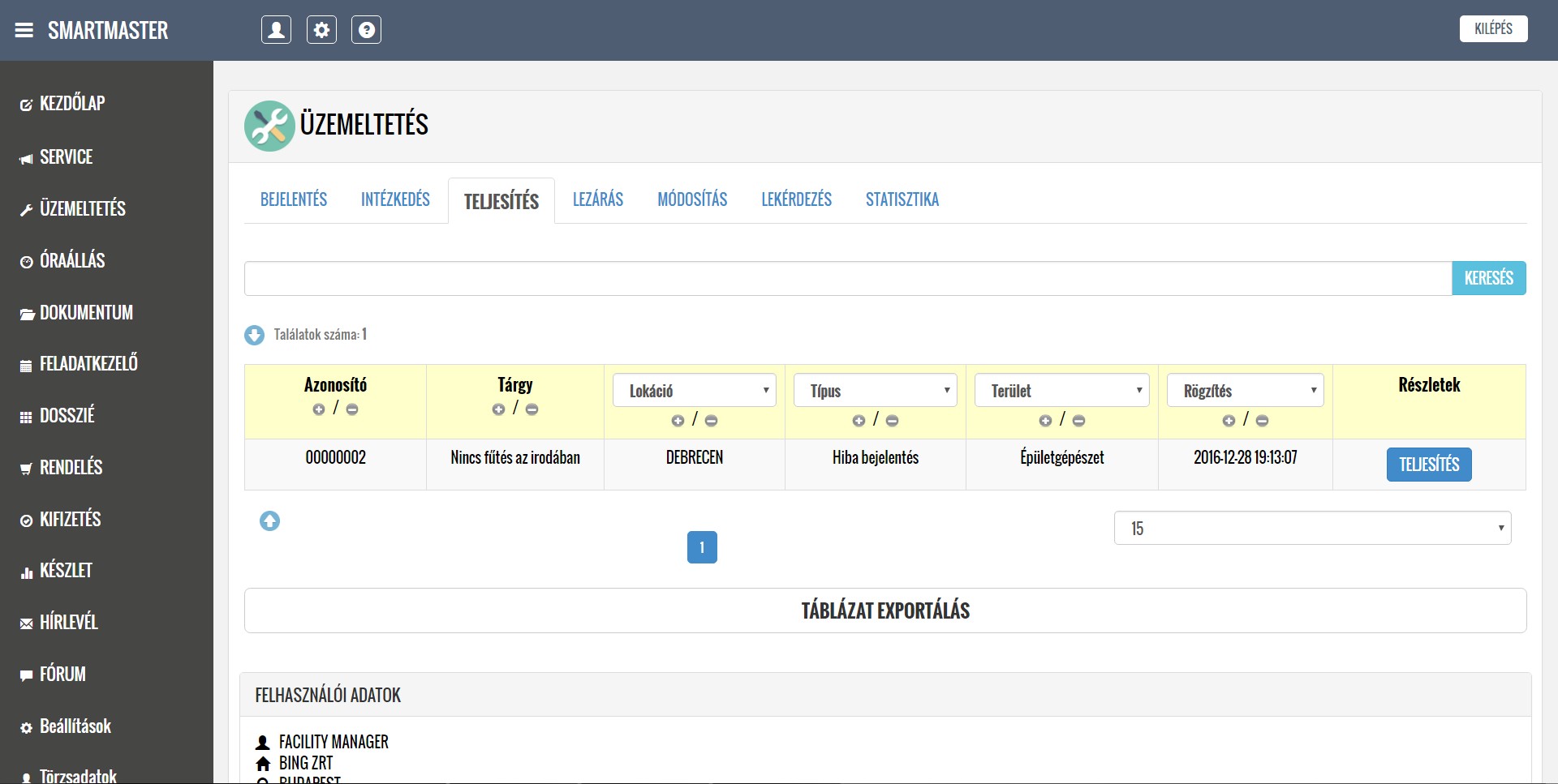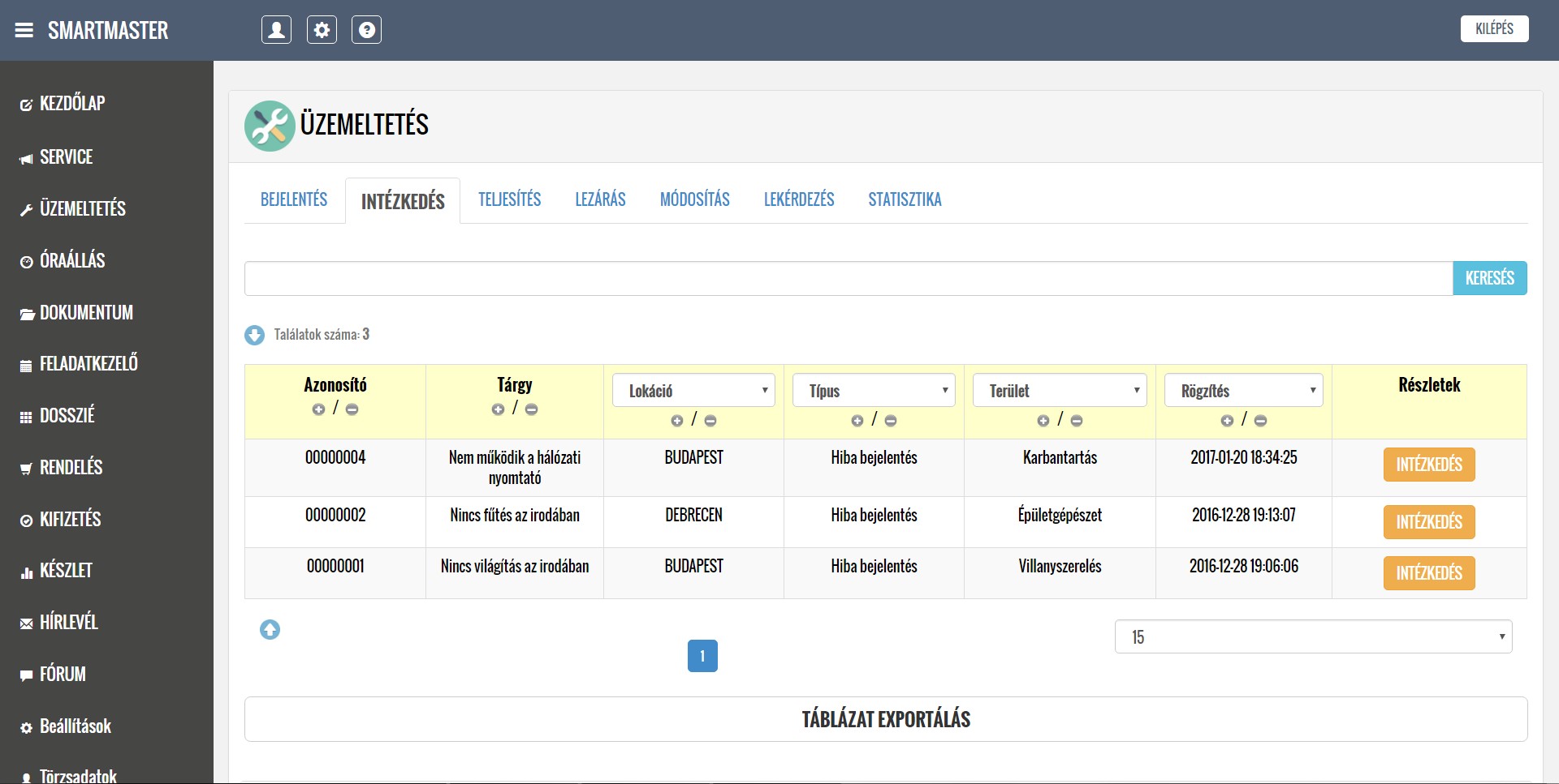 A rendszer segítségével kezelni tudják a lokációkból érkező hibabejelentéseket, ütemezik és dokumentálják a karbantartási feladatokat, illetve nyilván tartják a közüzemi mérőórák fogyasztásait